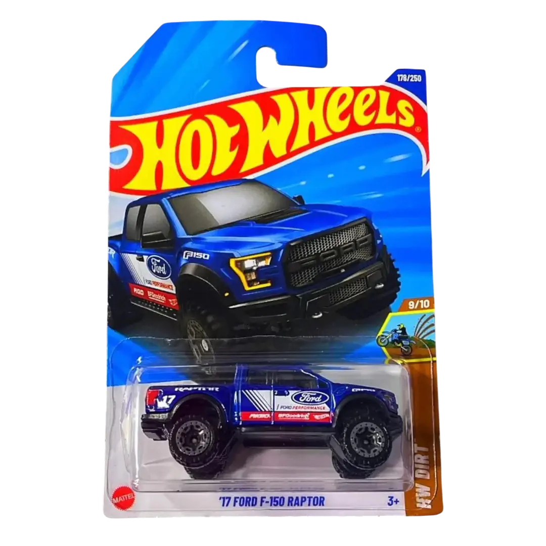 Esta variante azul es muy buscada por coleccionistas por su estética limpia y su fidelidad al diseño original del Raptor. Ideal para exhibiciones temáticas de camionetas o para complementar una colección de HW Dirt.